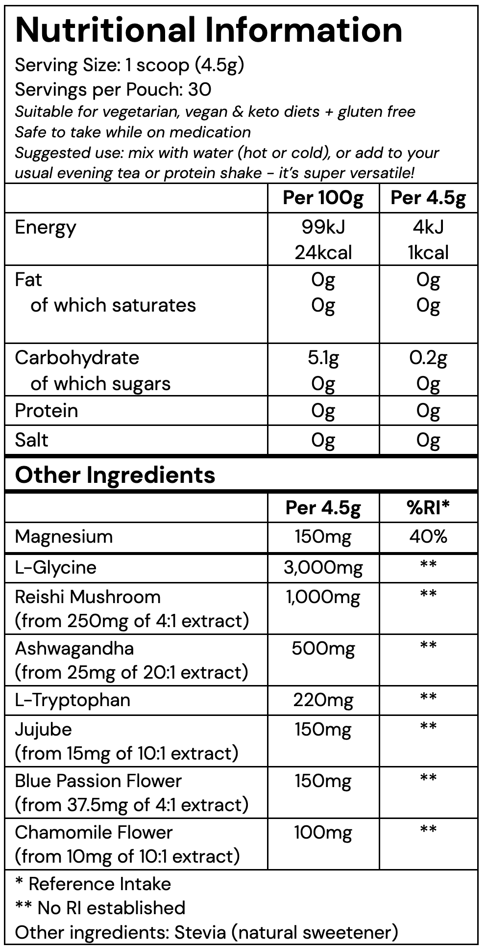 reishi mushroom ,ashwagandha ,jujube ,l-glycine ,passion flower ,magnesium ,l-tryptophan &chamomile