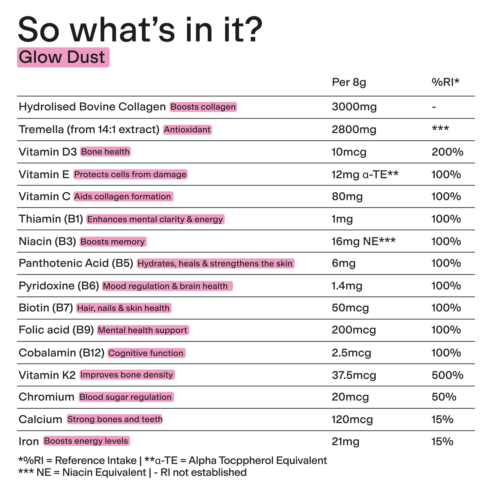 Ingredients: Hydro Dust is packed full of functional ingredients, here are some more details