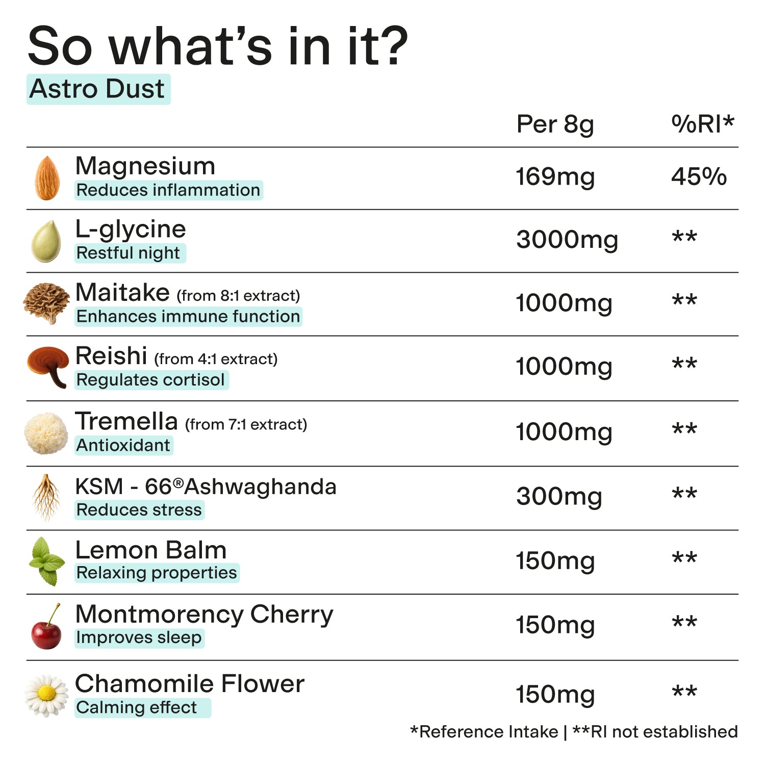 We recommend enjoying an 8g serving of Astro Dust as you begin to wind down in the evenings, perfect for getting ready for a restful night’s sleep. Everyone’s schedule is different, so feel free to find the timing that works best for you!