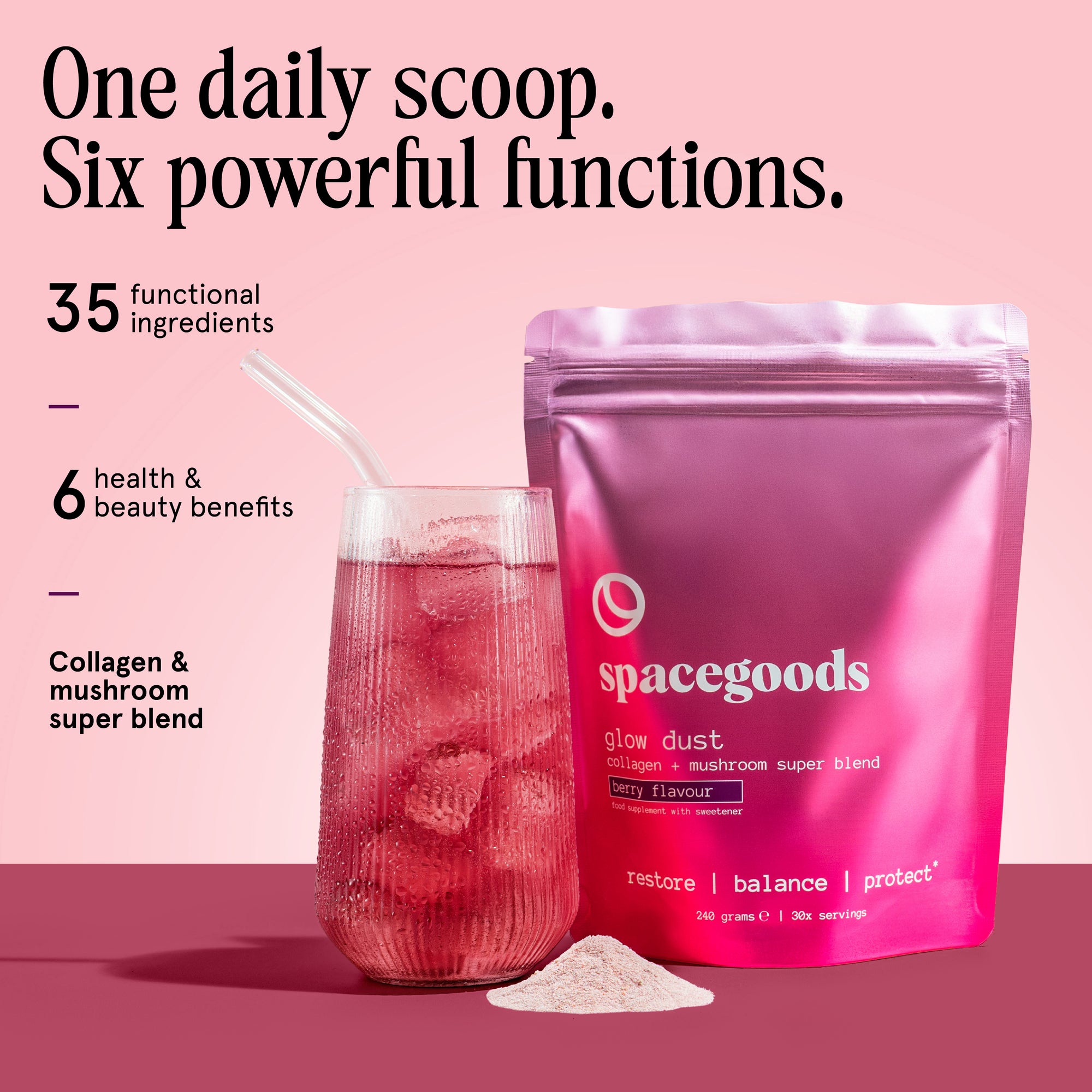 Glow Dust combines multivitamins, functional mushrooms, and collagen to create a blend that promotes balance, protection, and restoration. A daily blend your taste buds, body, and mind will love.