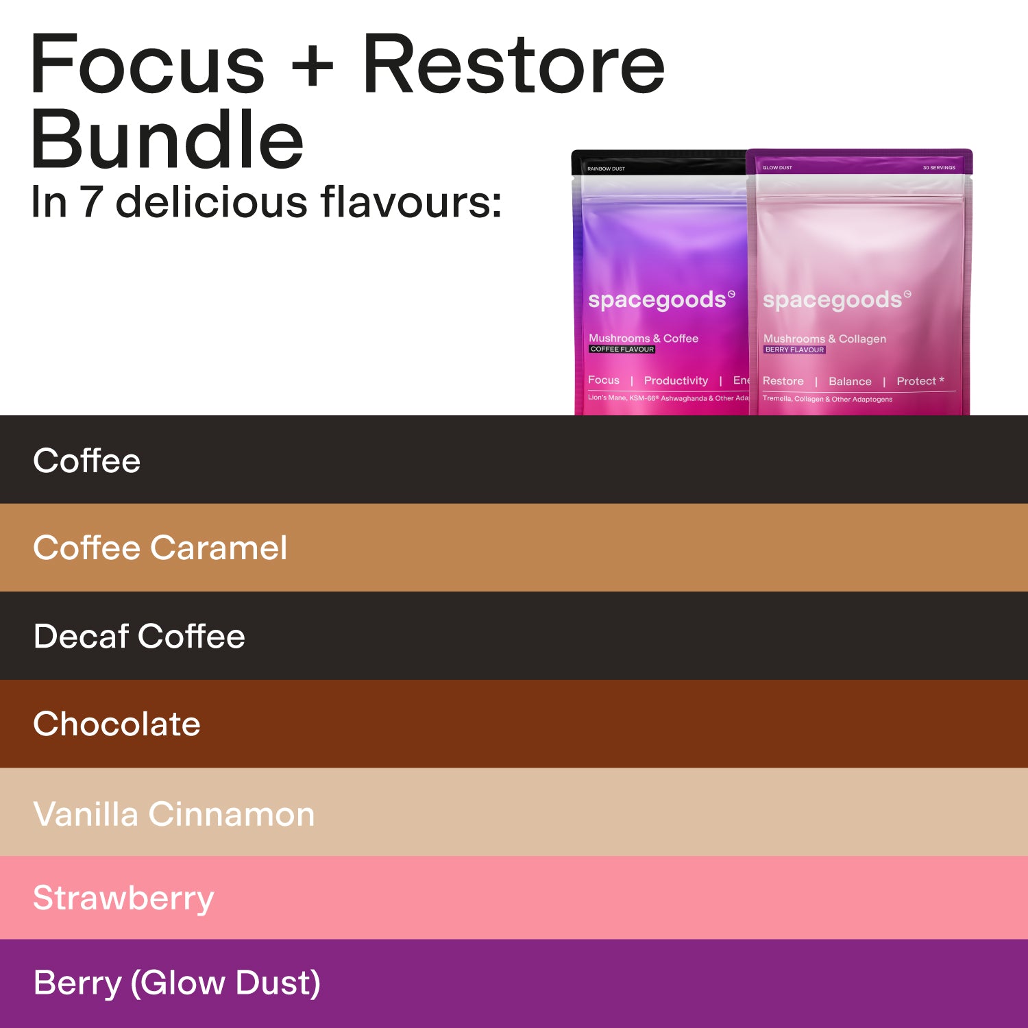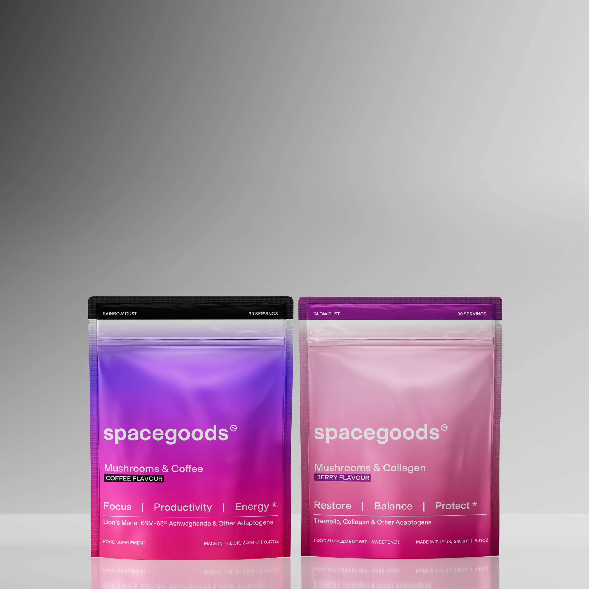 Rainbow Dust combines the coffee you love with functional mushrooms and adaptogens to promote focus, energy, and calm - great taste without the jitters, anxiety, or crash. Glow Dust blends multivitamins, functional mushrooms, and collagen to promote balance, protection, and restoration - a daily ritual your taste buds, body, and mind will love.