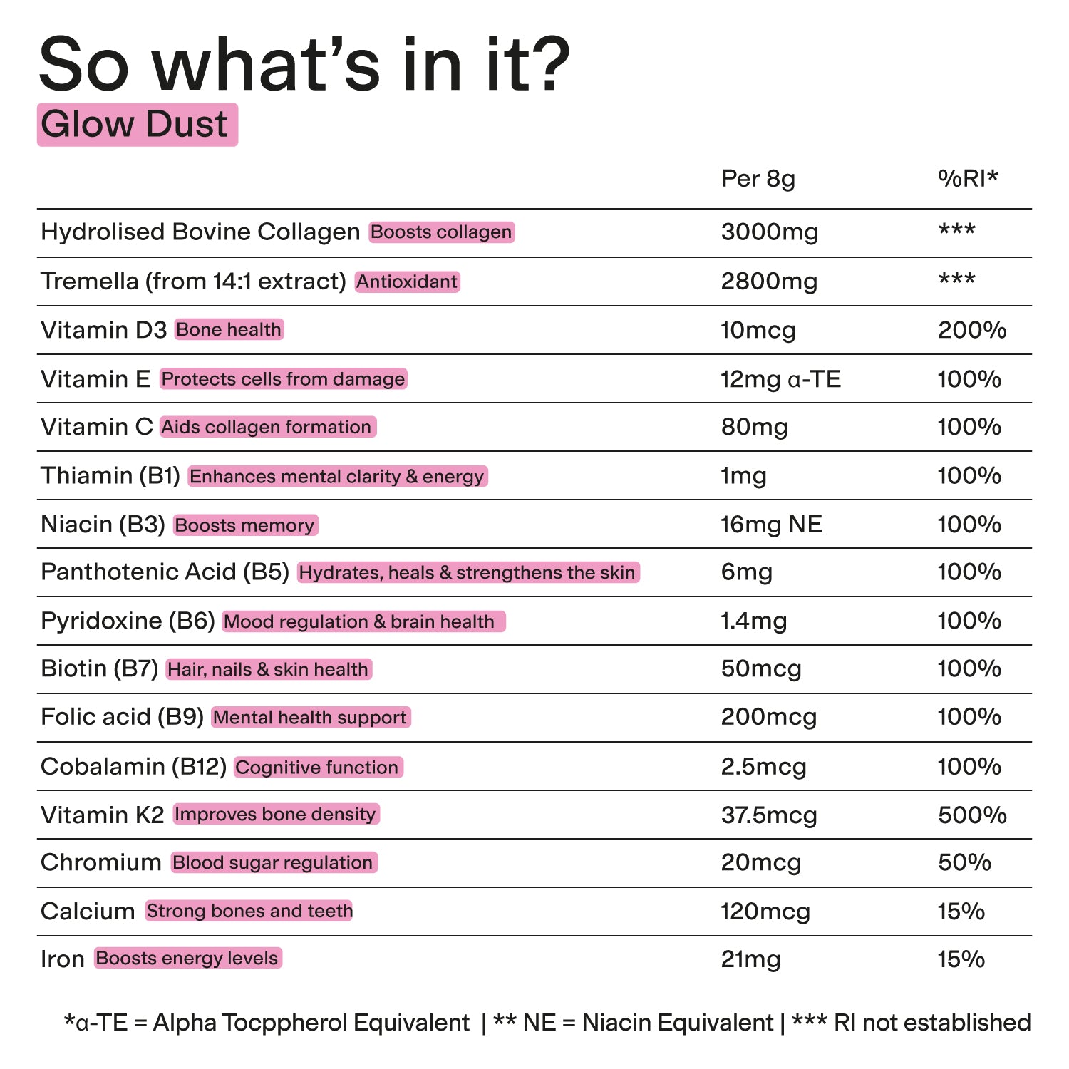 Ingredients: Hydro Dust is packed full of functional ingredients, here are some more details