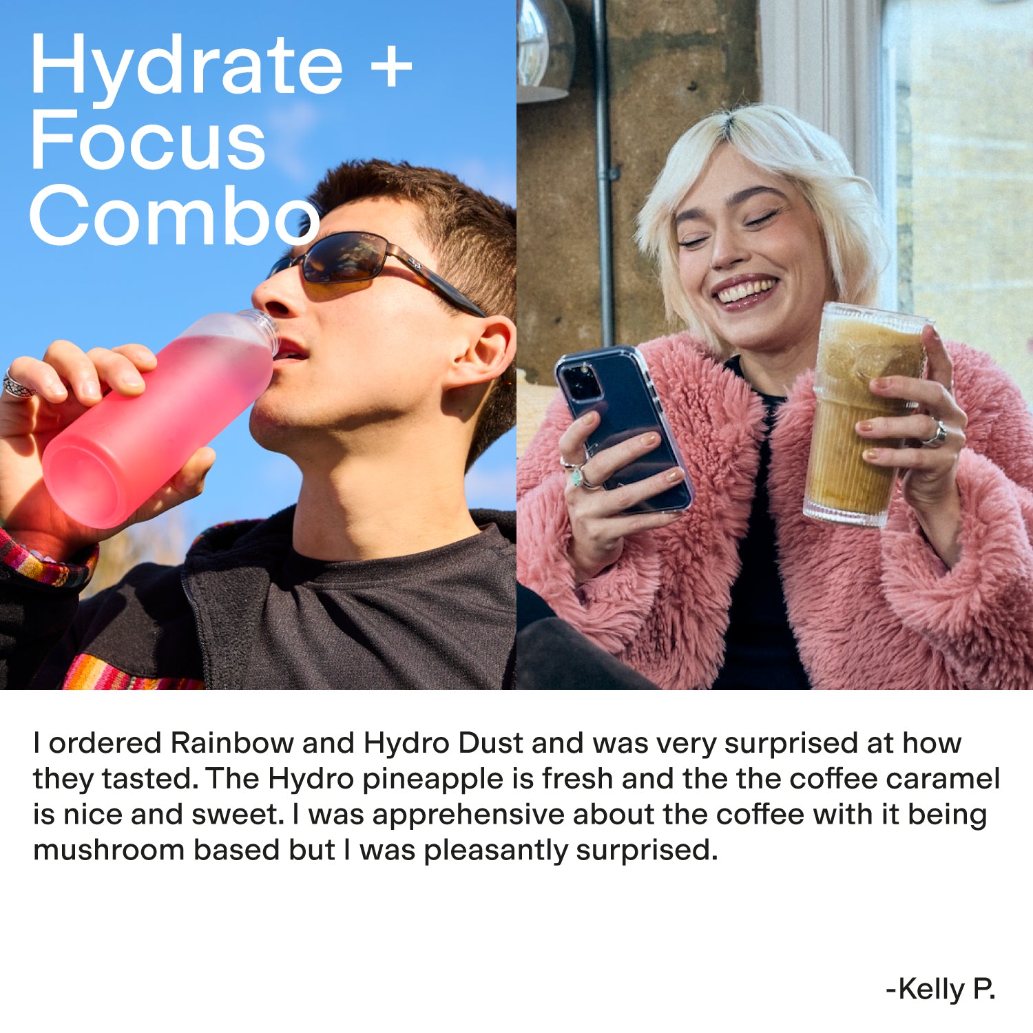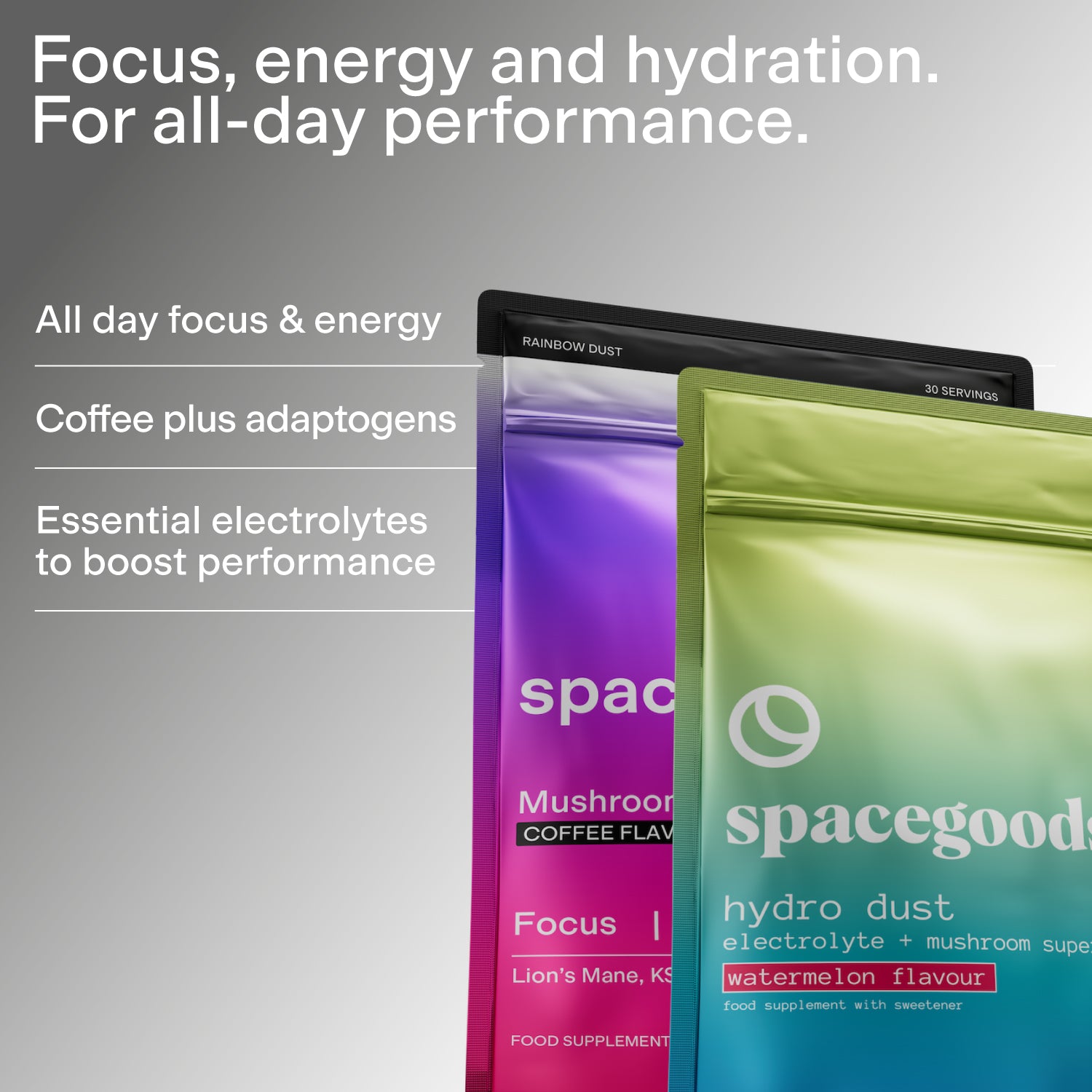 Hydro Dust blends electrolytes, real fruit powders, and adaptogenic mushrooms to deliver hydration that goes beyond thirst. Designed to hydrate, energise, and refresh in mouth-watering Pineapple or Watermelon - so you stay hydrated, feel great, and perform at your best.