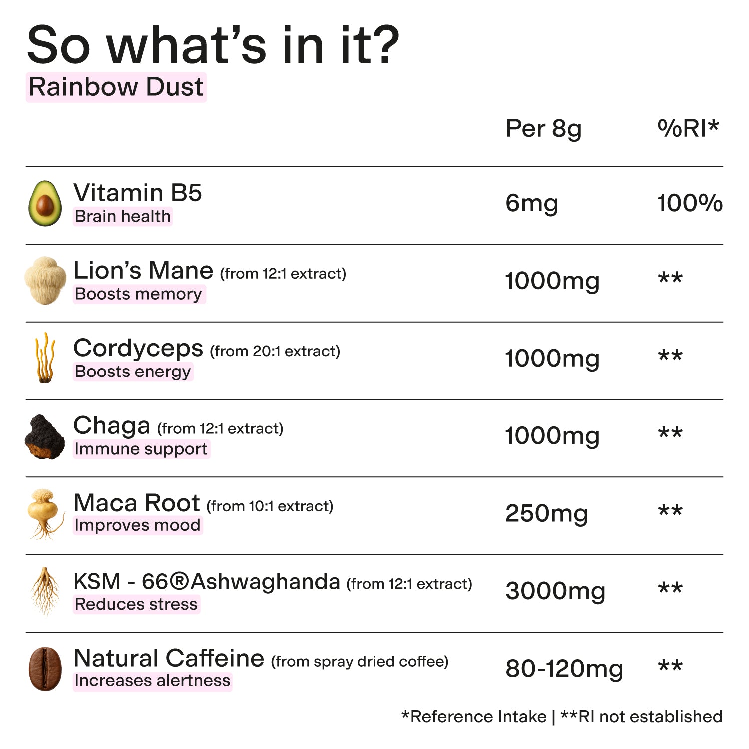 Rainbow Dust contains a range of functional ingredients. Here’s some more details