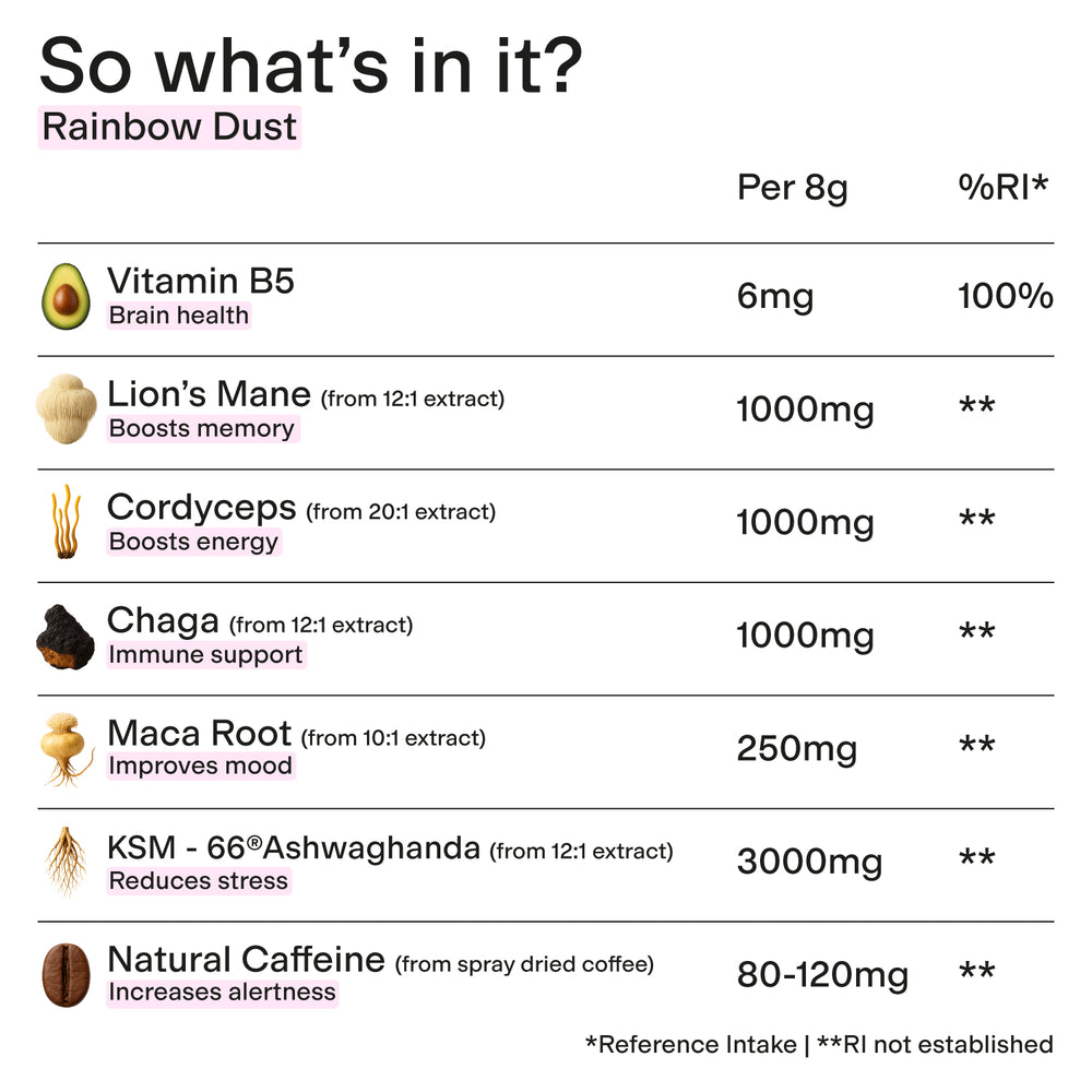 We’ve designed Rainbow Dust to be the ultimate "all-in-one" blend - simple, effective, and effortlessly powerful. Just one 8g serving in the morning will keep you going strong throughout the day!