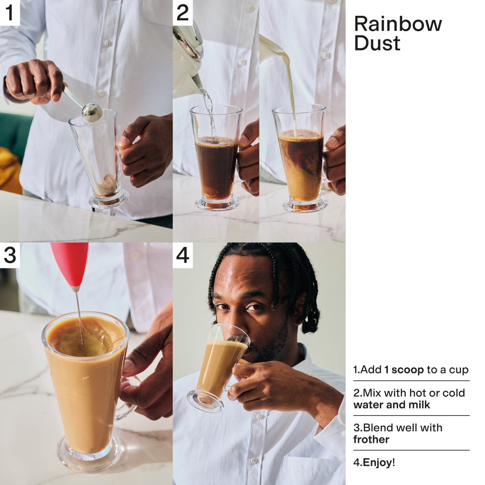 Rainbow Dust is a super versatile and convenient blend that fits seamlessly into your routine. Whether you enjoy it on its own with water or milk, or mix it into your usual coffee, tea, or protein shake - Rainbow Dust adapts to your lifestyle.