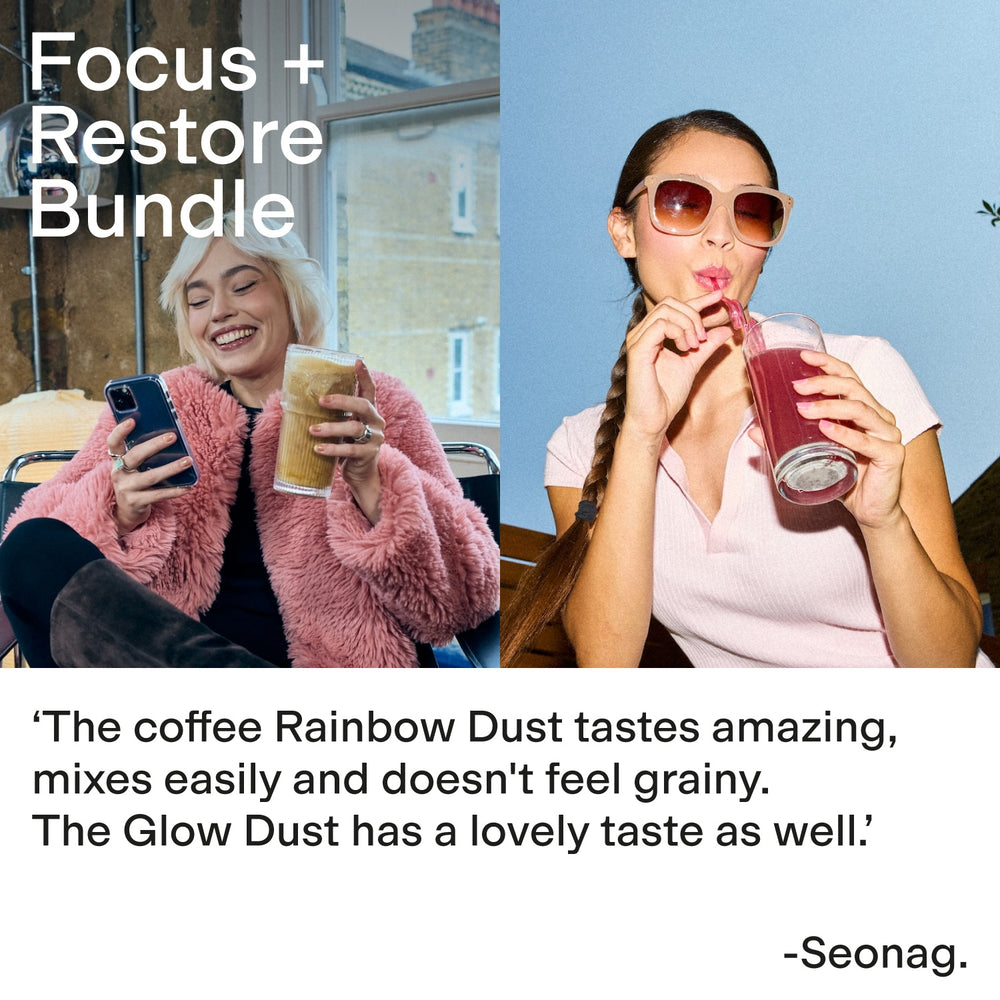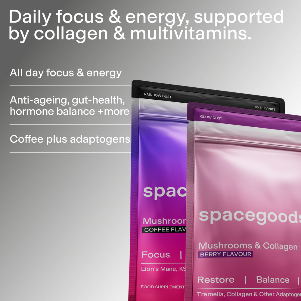 Rainbow Dust combines the coffee you love with functional mushrooms and adaptogens to promote focus, energy, and calm - great taste without the jitters, anxiety, or crash. Glow Dust blends multivitamins, functional mushrooms, and collagen to promote balance, protection, and restoration - a daily ritual your taste buds, body, and mind will love.