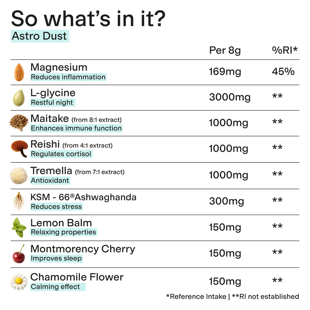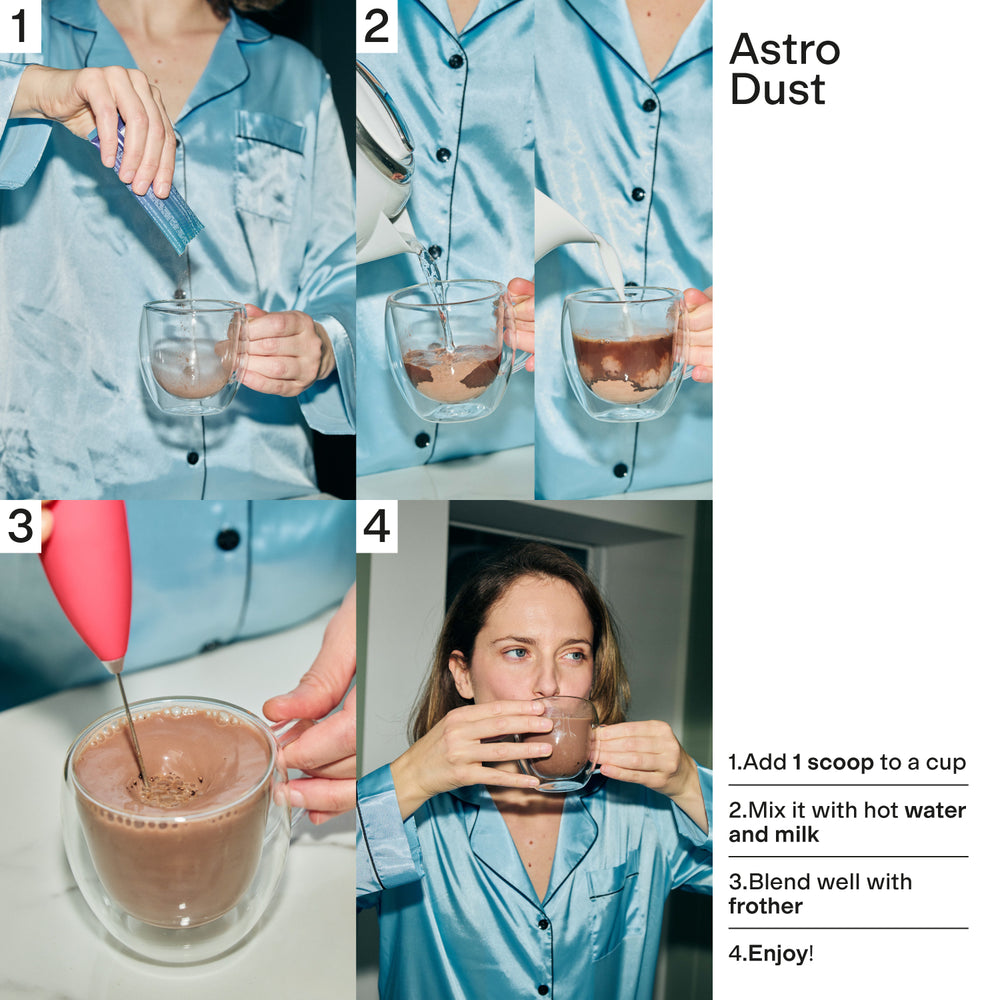 For the ultimate cozy experience, try making your Astro Dust just like a hot chocolate -rich, warm, and comforting before bed.