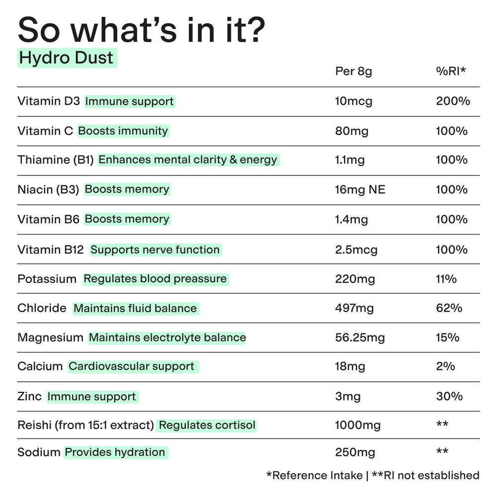 Hydro Dust is designed to do more than just hydrate - it helps replenish essential electrolytes that are lost through sweat, exercise, or travel. It’s a great option when your body needs more than water to stay balanced and energised