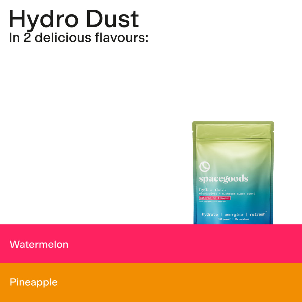 HYDRO DUST BLENDS ELECTROLYTES, REAL FRUIT POWDERS & ADAPTOGENIC MUSHROOMS TO DELIVER HYDRATION THAT GOES BEYOND THIRST. DESIGNED TO HYDRATE, ENERGISE AND REFRESH - IN MOUTH WATERING PINEAPPLE OR WATERMELON. STAY HYDRATED, FEEL GREAT, AND PERFORM AT YOUR BEST.