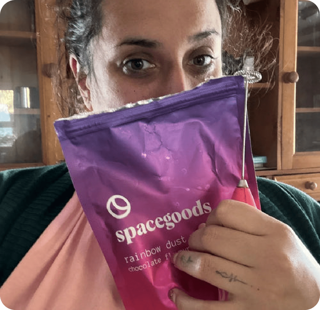 "I absolutely love this product. It’s a total game changer. I think I’ve been a coffee addict for about 10 years now and I’ve tried many products to kind of get me off of the caffeine grind. Nothing stuck but Spacegoods is definitely a winner. It tastes like hot chocolate and is lovely with almond milk. The first time taking it I felt alert and awake but not in the jittery way you usually feel with coffee"